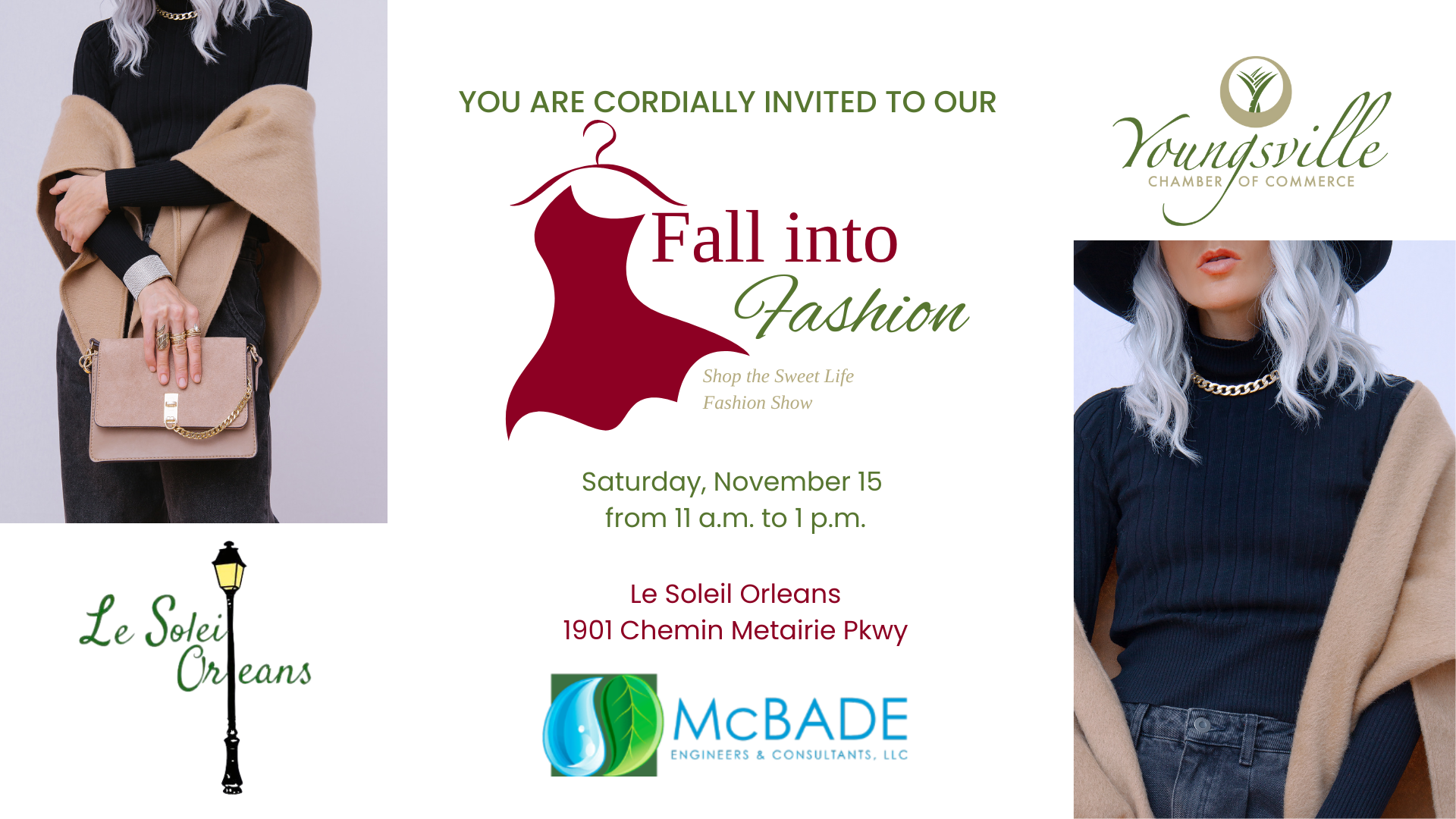 Step into style at Fall into Fashion, a runway event featuring Youngsville’s local boutiques! Join us on Saturday, November 15, 2025, from 11:00 AM – 1:00 PM at Le Soleil Orleans as we showcase the latest fall looks for ladies and children. From cozy everyday outfits to holiday-ready styles, this event is your sneak peek at what’s trending this season.