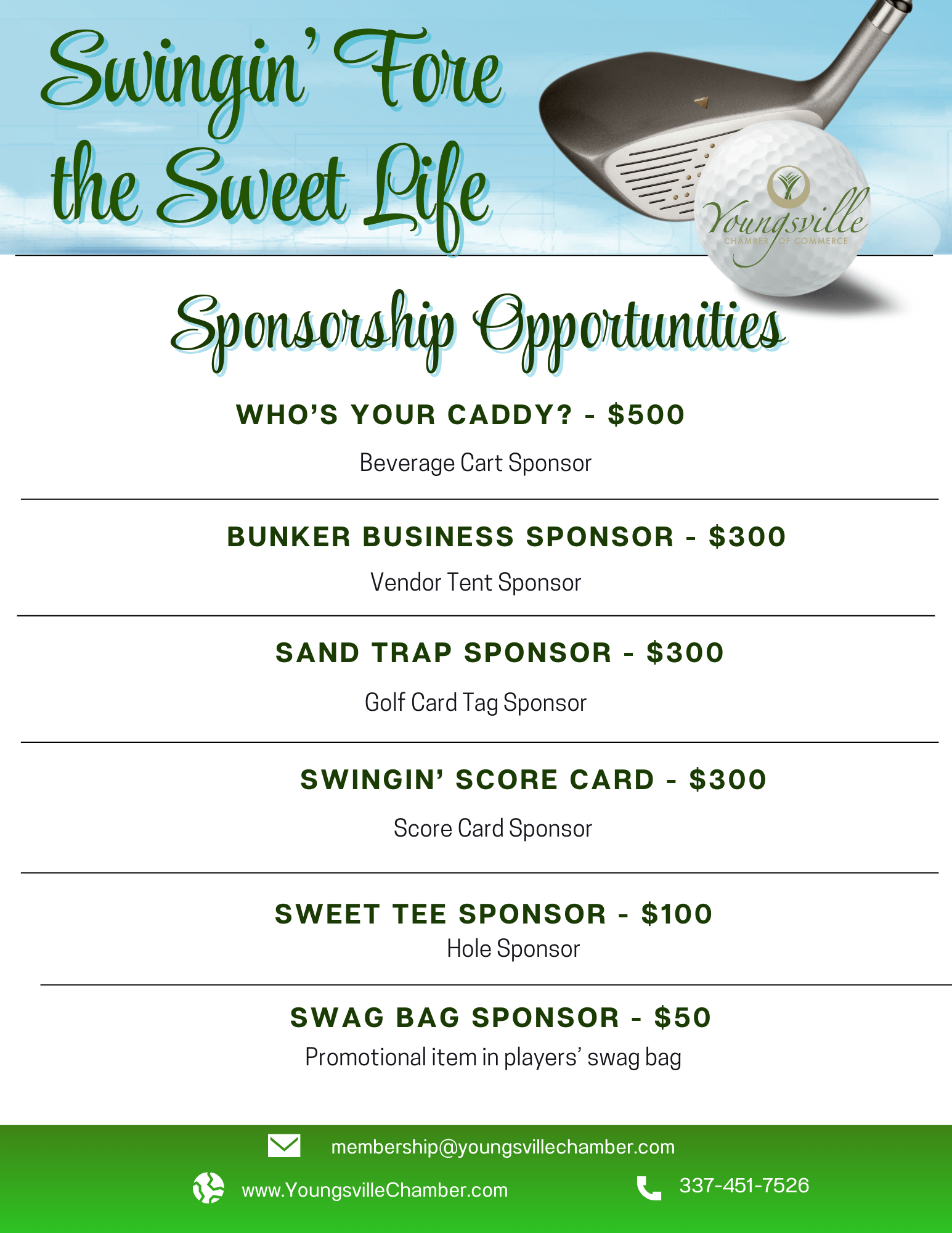 The Youngsville Chamber of Commerce proudly invites you to our 5th Annual Swingin’ Fore the Sweet Life Golf Tournament, a fun-filled day on the greens!
